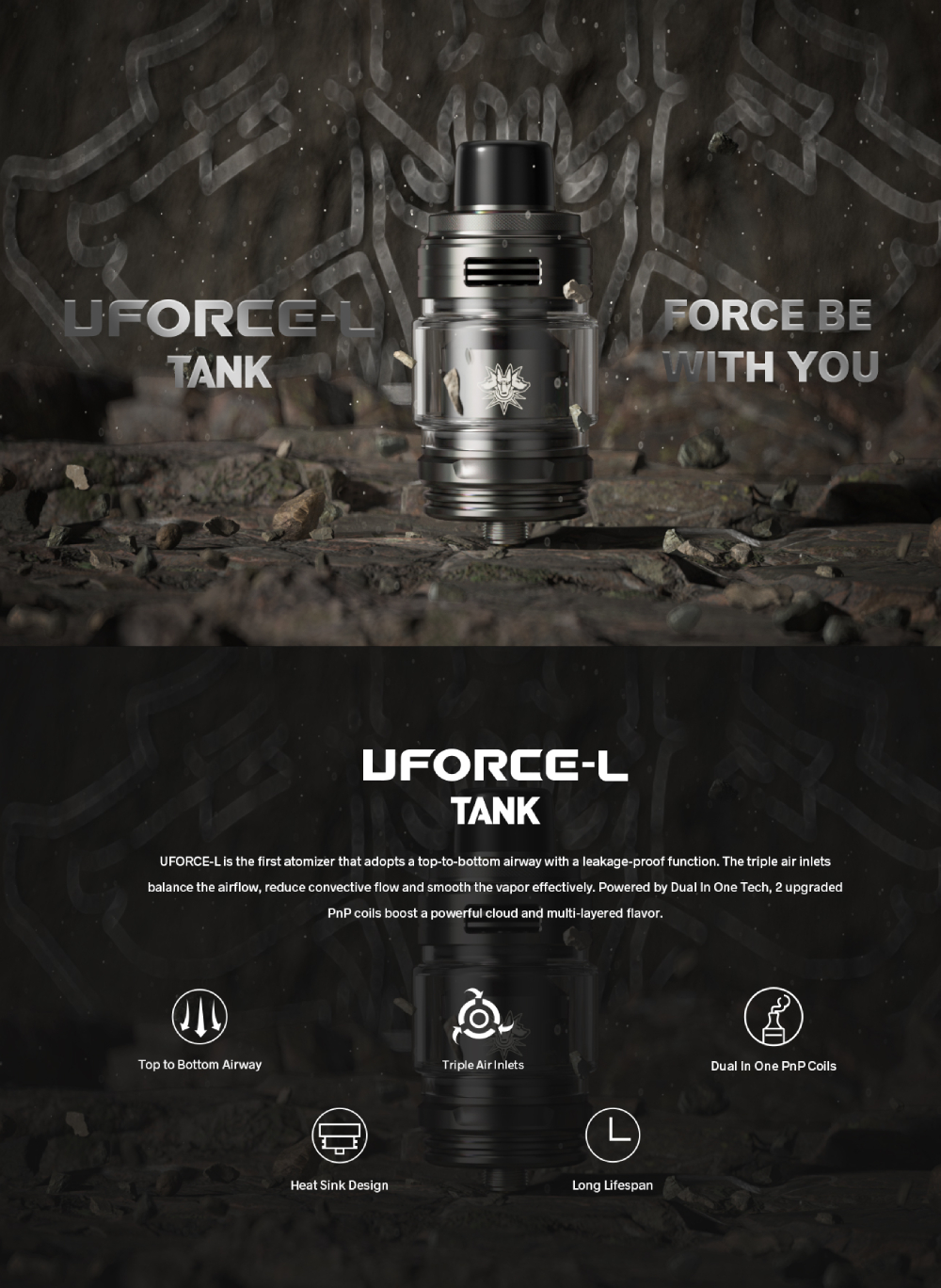 Le réservoir UFORCE - L est le PREMIER atomiseur VOOPOO PnP avec lentrée dair supérieure et le design supérieur anti-fuite. Il est compatible avec un drip tip de 810 et est équipé dun fond fileté de 510. Compatible avec les réservoirs interchangeables de e-liquide en verre Pyrex de 2ml, 4ml, et 5,5ml, le réservoir UFORCE-L pourrait offrir plus de choix aux utilisateurs.