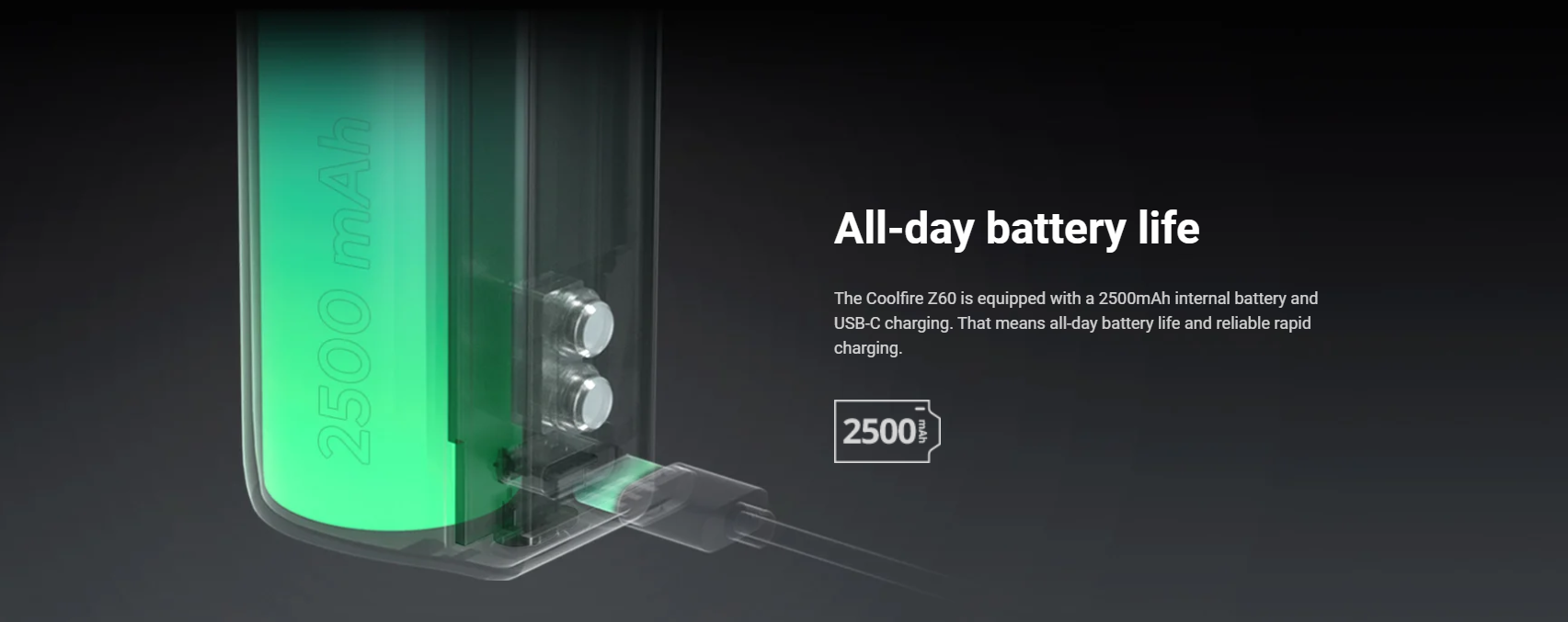 La Coolfire Z60 peut être complètement éteinte pour des raisons de sécurité, et en fait, toutes les fonctions de sécurité attendues sont intégrées. Alimenté par une batterie de 2500 mAh, ce dispositif élégant vous permet de lutiliser toute la journée sans avoir besoin de le recharger, mais il peut être rechargé rapidement grâce à la charge USB de type C en vapotage. Lindicateur de durée de vie de la batterie garde une trace de la charge restante et vous pouvez choisir la puissance souhaitée de 6 à 60 W.